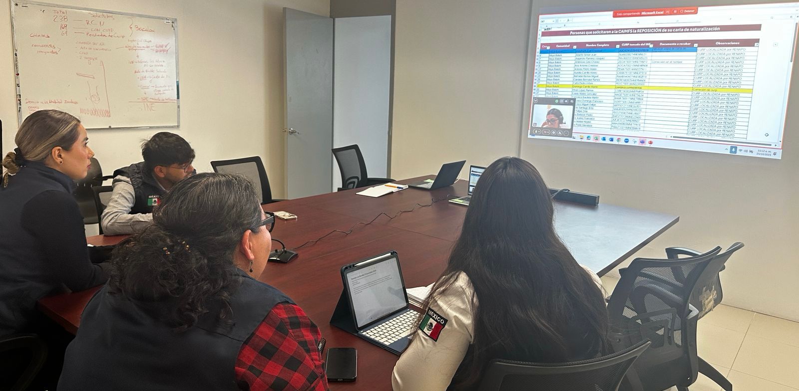 Este día servidores públicos de la Coordinación para la Atención Integral de la Migración en la Frontera Sur (CAIMFS), participaron en una video reunión de trabajo con funcionarios del municipio de Bacalar, Quintana Roo; con el propósito de coordinar las acciones correspondientes en el proceso de reposición de cartas de naturalización, para de esa forma garantizar el derecho a la identidad jurídica de personas de origen guatemalteco que residen en la comunidades de Kuchumatán, Maya Balam, San Isidro la Laguna y Miguel Hidalgo de dicho municipio.